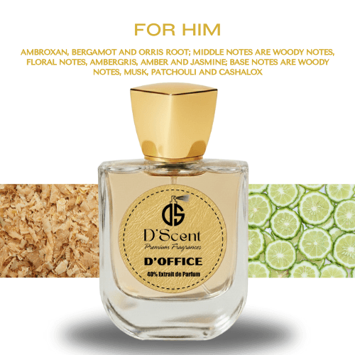 D’Office, inspiration of Office For Men is a Woody Spicy fragrance for men. Top notes are Ambroxan, Bergamot and Orris Root; middle notes are Woody Notes, Floral Notes, Ambergris, Amber and Jasmine; base notes are Woody Notes, Musk, Patchouli and Cashalox.